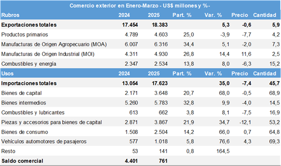 En el primer trimestre de 2025, la balanza comercial de la Argentina registró un superávit de US$761 millones: las exportaciones sumaron US$ 18.383 millones y las importaciones US$ 17.623 millones.
