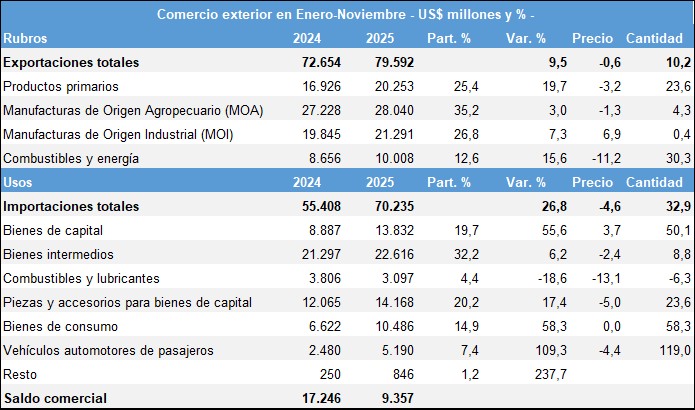 En enero-noviembre de 2025, la balanza comercial de Argentina registró un superávit de US$9.357 millones: las exportaciones sumaron US$ 79.592 millones y las importaciones US$ 70.235 millones.