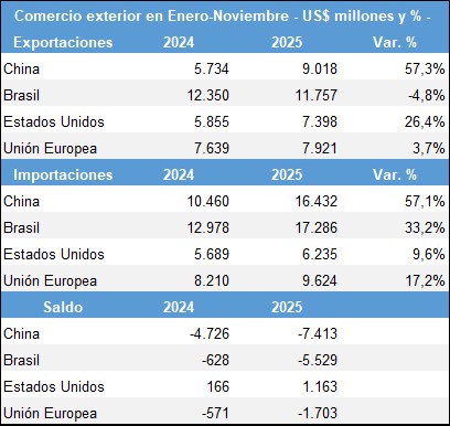 Las exportaciones aumentaron 26,4% a Estados Unidos, 57,3% a China y 3,7% a la Unión Europea, mientras que cayeron 4,8% a Brasil (Cuadro 2).